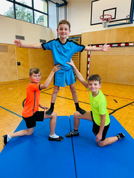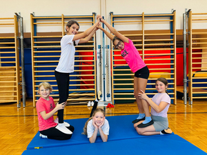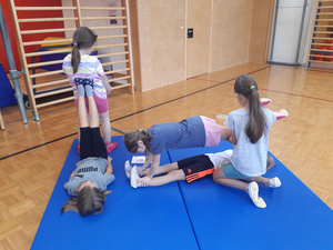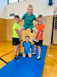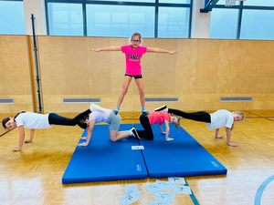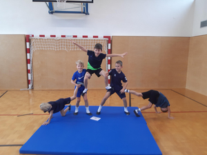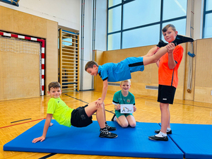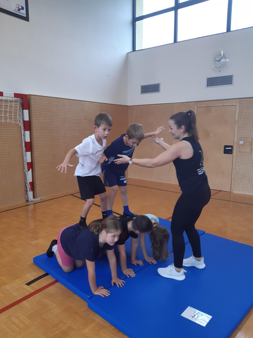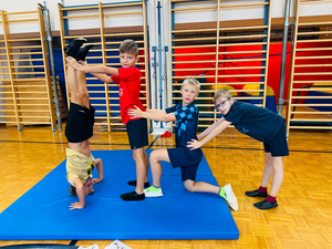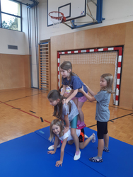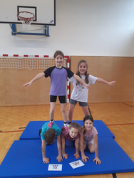 Nadine Weber, die seit diesem Schuljahr bei uns an der Schule unterrichtet, ließ die Kinder der 4a an ihrem Hobby teilhaben. Die erfahrene Sportakrobatin und Trainerin erklärte den Kindern Grundlagen der Sportakrobatik und ließ sie dann Figuren nachbauen. Dabei stellten sich die Kinder sehr geschickt an!