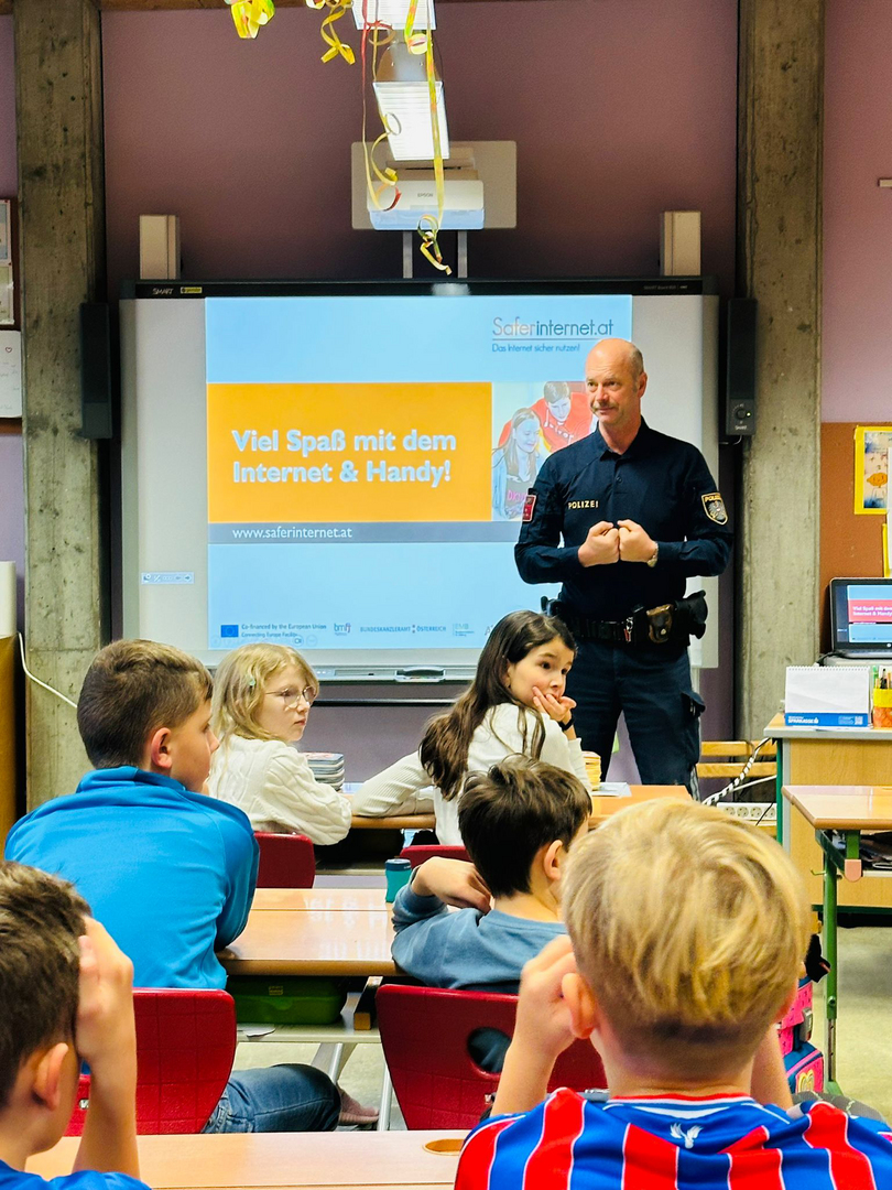 Die Schulkinder der beiden 4. Klassen nahmen am zweistündigen Workshop „Cyberkids“ teil. Unter fachkundiger Leitung von Inspektor Georg Weber und Inspektorin Heidi Katzenschlager erhielten die Kinder altersgerechte und praxisnahe Einblicke in die digitale Sicherheit.