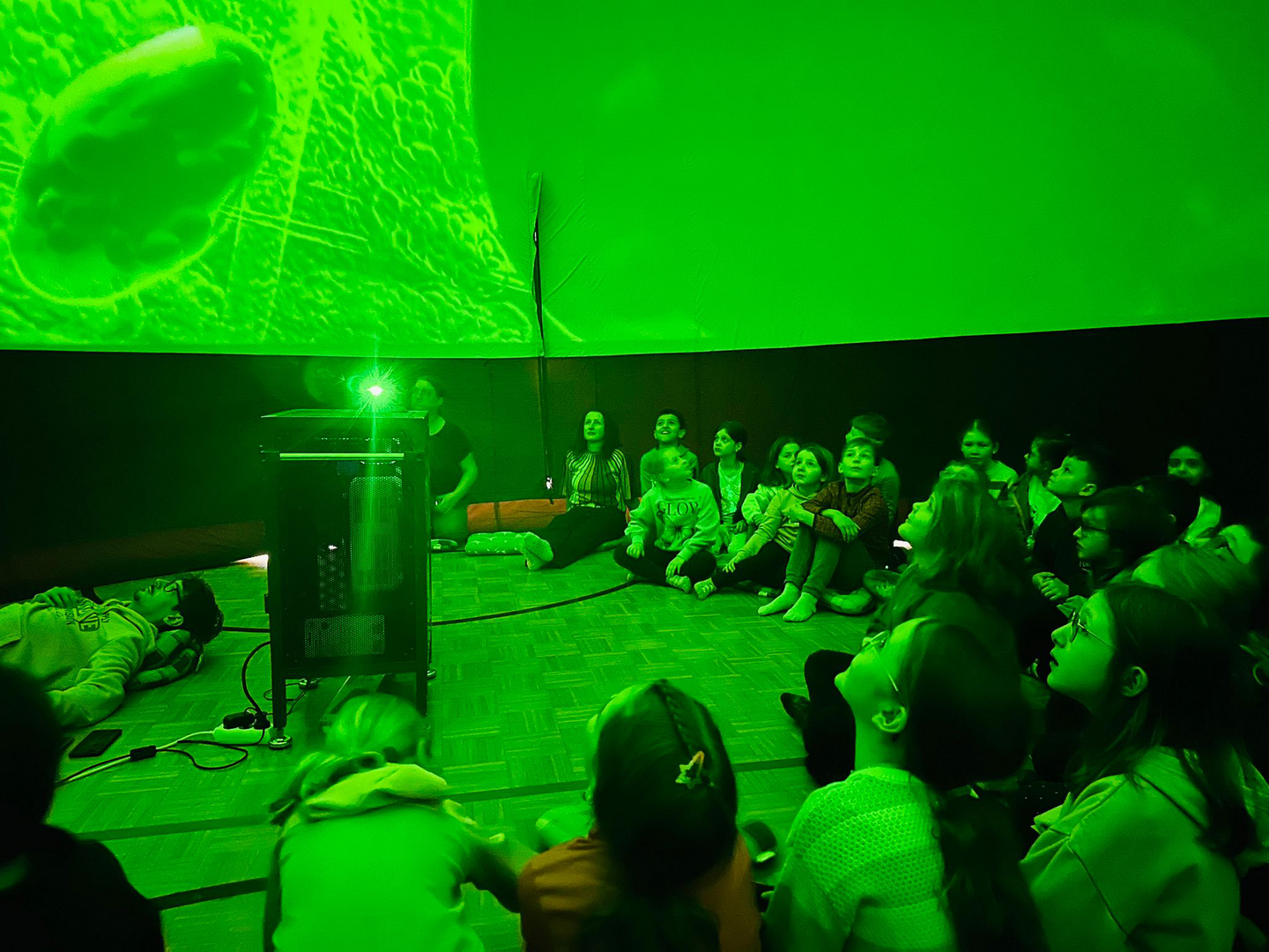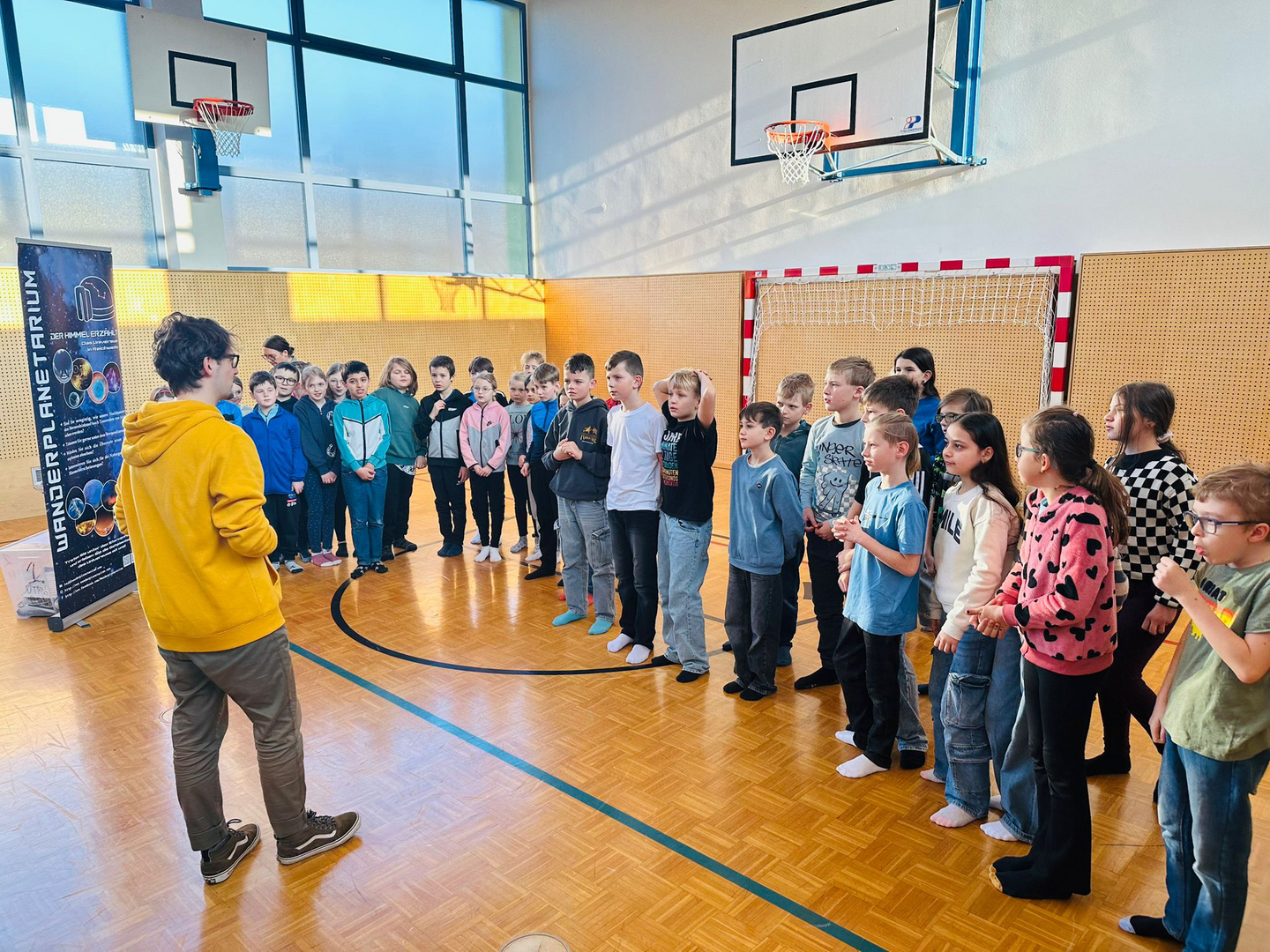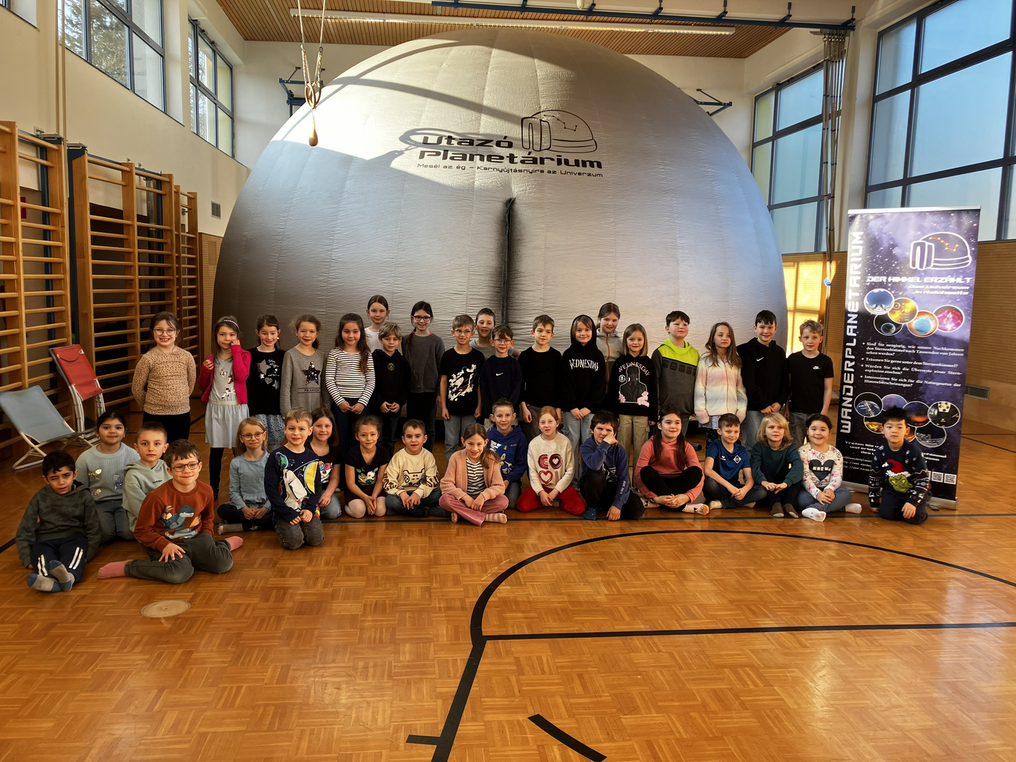Dank der großzügigen Unterstützung des Elternvereins konnten wir das Wanderplanetarium zu uns einladen. Der Turnsaal verwandelte sich in den Weltraum. In der riesigen, aufblasbaren Kuppel tauchten die Kinder in die geheimnisvolle Welt der Planeten, Sterne und Galaxien ein. Die beeindruckenden Bilder und realitätsnahen Animationen sorgten für Staunen und große Begeisterung.