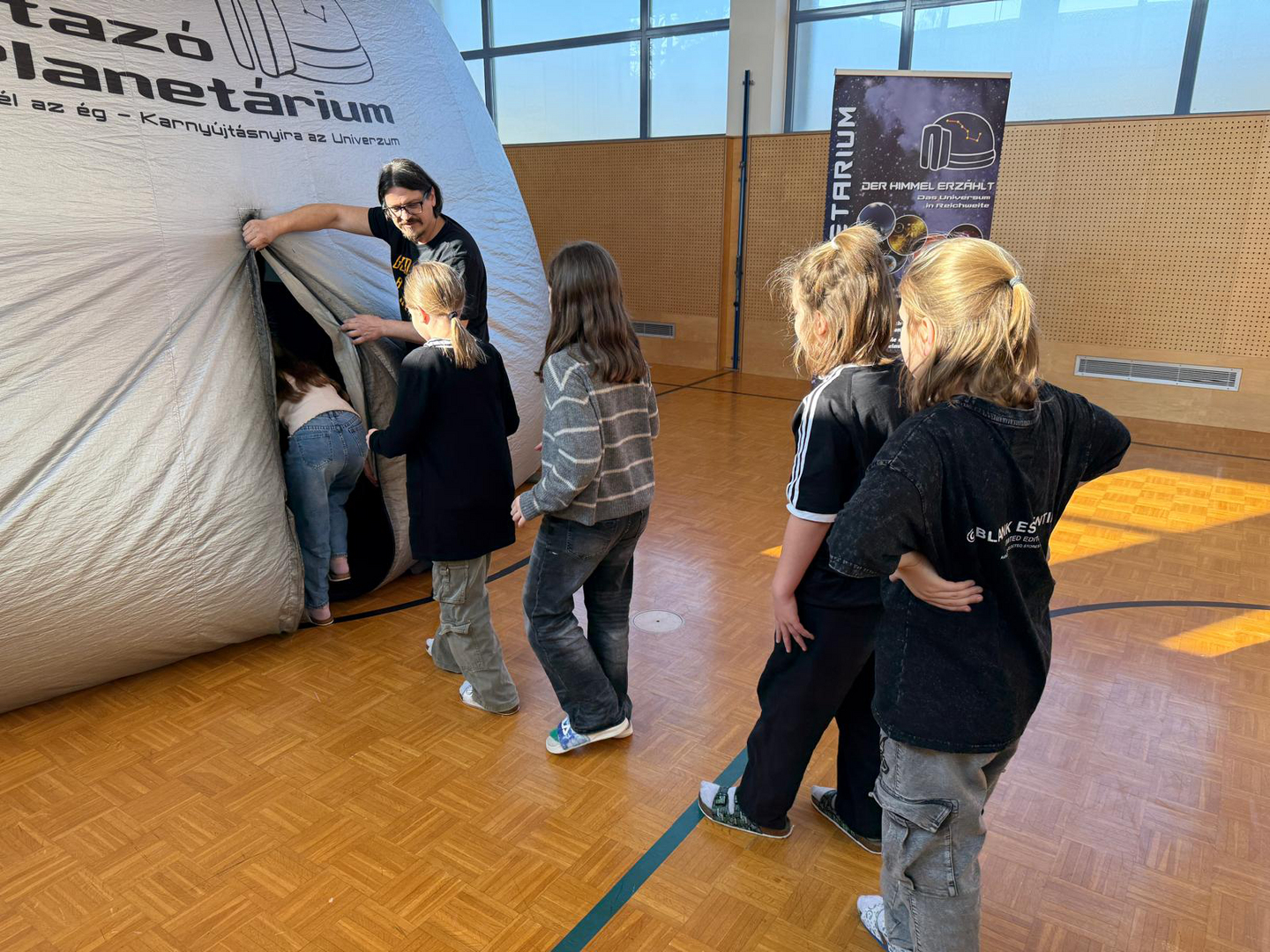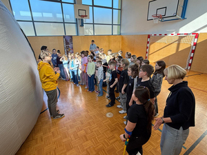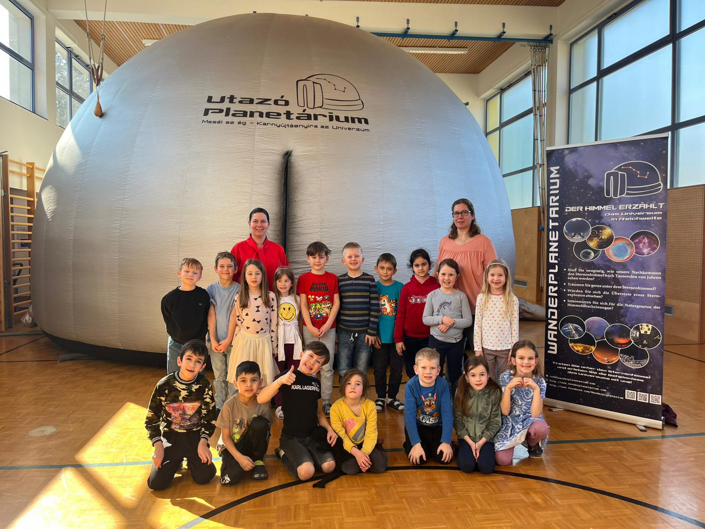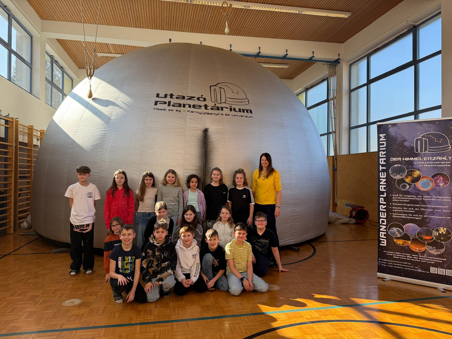 Dank der großzügigen Unterstützung des Elternvereins konnten wir das Wanderplanetarium zu uns einladen. Der Turnsaal verwandelte sich in den Weltraum. In der riesigen, aufblasbaren Kuppel tauchten die Kinder in die geheimnisvolle Welt der Planeten, Sterne und Galaxien ein. Die beeindruckenden Bilder und realitätsnahen Animationen sorgten für Staunen und große Begeisterung.