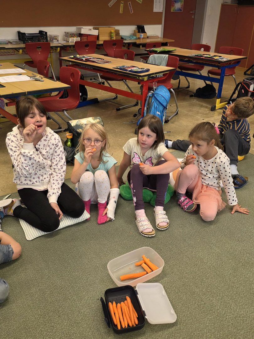Die Kinder verkosteten Karotten und Karottensaft und erfuhren mehr über deren Anbau und Ernte.