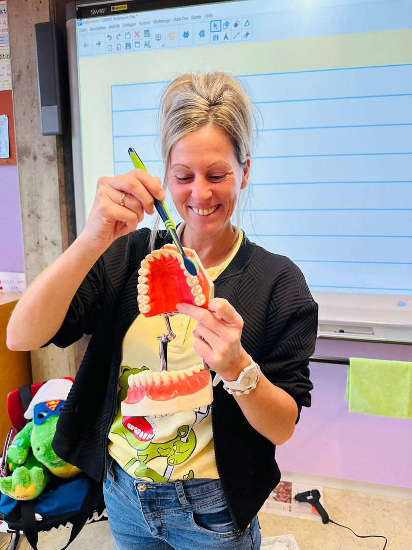 Beim Besuch von Zahngesundheitserzieherin Anita Holzinger erfuhren die Kinder, aus welchen Schichten ein Zahn aufgebaut ist. Auch die unterschiedlichen Putztechniken mit Handzahnbürste und elektrischer Zahnbürste wurden besprochen und gleich ausprobiert.